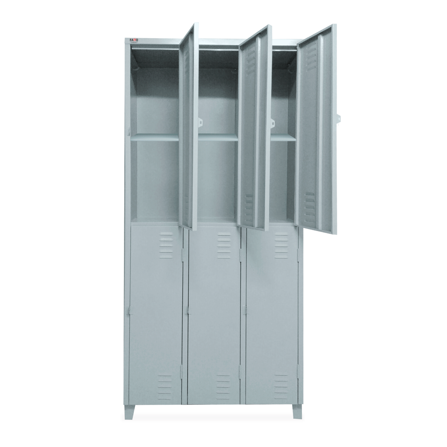 O Roupeiro de Aço 6 Portas Grandes com Prateleira é ideal para ambientes corporativos, academias e vestiários industriais que precisam de espaço individual e organização interna. Cada porta possui pitão para cadeado, ventilação frontal e prateleira superior interna, permitindo separar objetos como mochilas, calçados e uniformes.